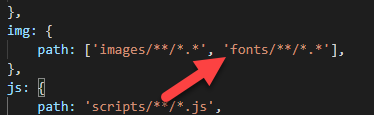 Thanks to Mark Cassidy for this, but the fix really is pretty simple. The problem is that the fonts directory of your local theme just isn't anywhere in the config to be watched or uploaded. So, open up the gulp/config.js and add 'fonts/**/*.*' to one of the sections. I chose the img: section.