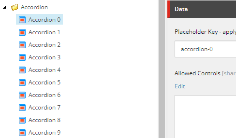 I do this because, when creating components that use Dynamic Placeholders, you have to pre-create a Placeholder Settings item for each possible dynamic placeholder that your component might use. IMO, this kinda defeats the purpose of "dynamic placeholders", but I suppose that's an argument to be had over drinks at the bar during Symposium or SUGCON. :D Anyway, I limited the max number of accordion panels to 10. If you have an accordion that needs more than 10 panels, you should probably re-think how you're displaying your content. But I digress... I pre-create all of these items mostly so I don't have to deal with the "out-of-range" scenarios when working with the Accordion in Experience Editor. We just pre-create them all, then deal with hiding empty placeholders on the front end. :)