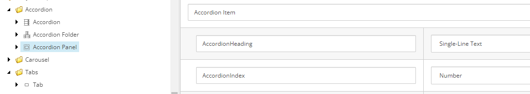 The Accordion doesn't have any fields and the Accordion Panel has the fields shown above. **Hint: the AccordionIndex should probably forshadow the "magic sauce" that makes this whole thing work...