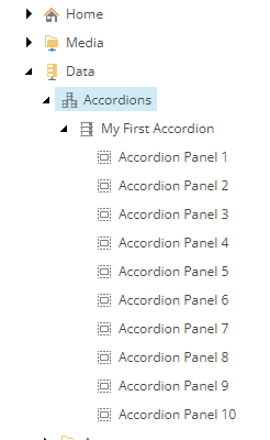 I'll start with the Accordion, as that's a bit more straightforward of an example. To begin, I created some templates. An Accordionthat will be the parent datasource, an AccordionPanelthat will be the child items representing each panel in the Accordion, and an Accordion Folder that would be the folder to hold shared accordions in the /Data folder. We'll see later why this template probably isn't even worth creating, but more on that later.