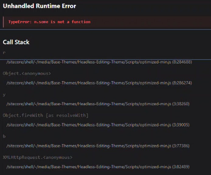 If you navigate to the Base Themes folder in the Media Library and open Headless Editing Theme/Scripts, you will likely find an item in there named optimized-min. Delete this item. It contains obsolete javascript from SXA.